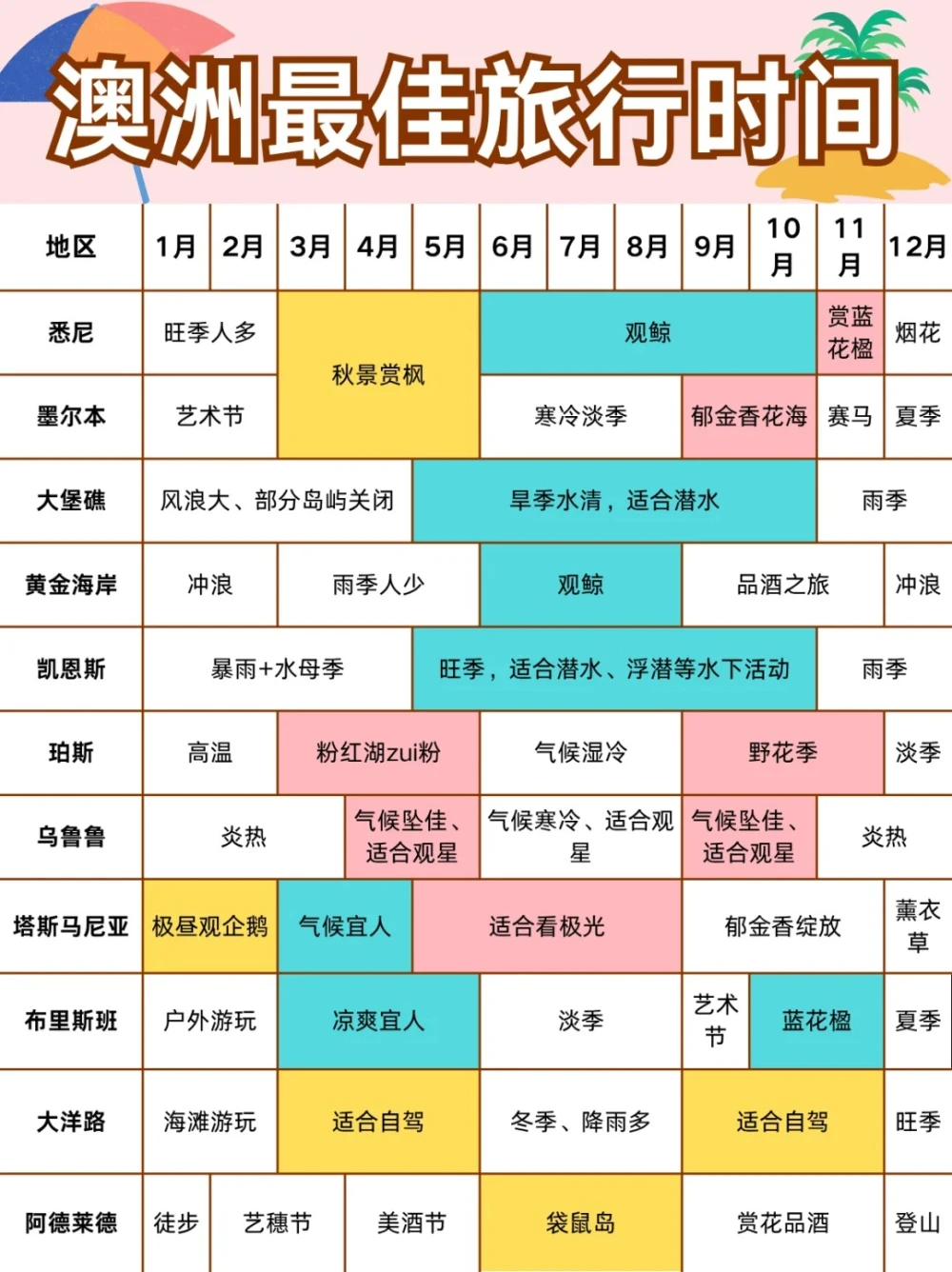 – 悉尼、墨尔本、布里斯班等东南沿海城市:春秋季(3-5月和9-11月)气候宜人,适合城市观光和海滩活动。