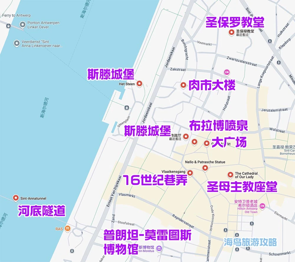 3、从梅尔街开始,即进入安特卫普老城最中心的区域。从梅尔街到安特卫普市政厅步行15分钟,这个区域集中了安特卫普最主要的景点,包括圣母主教座堂、龙龙与忠狗雕像、16 世纪巷弄、安特卫普大广场、市政厅、布拉博喷泉,以及稍远一点的肉市大楼、斯滕城堡和圣保罗教堂(圣保禄教堂)。