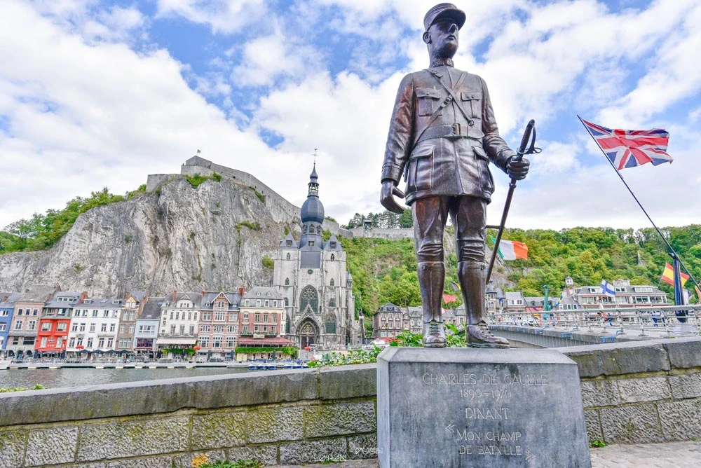 戴高乐桥横跨在马斯河上,是从迪南火车站到迪南镇中心的必经之路。一战期间,年轻的戴高乐曾作为法军一员,曾在此与德军激战并负伤。为了纪念他,这座桥被命名为戴高乐桥。桥头矗立着他的铜像。