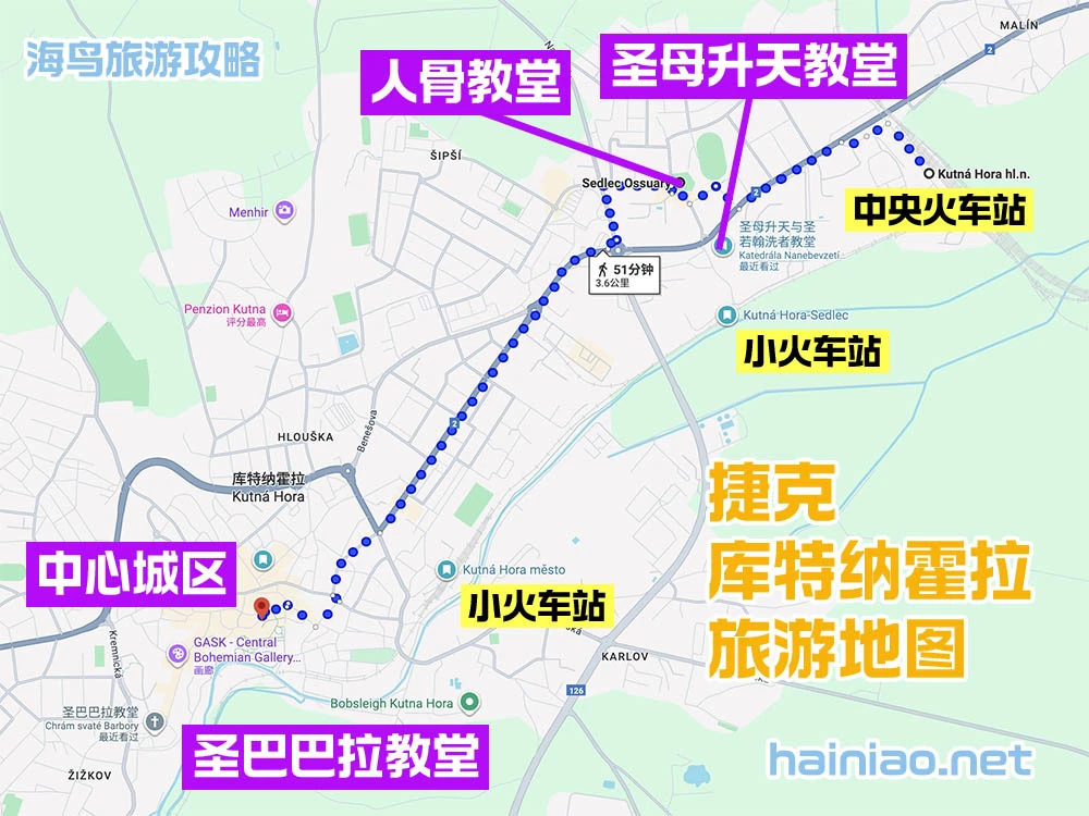 其中,人骨教堂和圣母升天与圣若翰洗者教堂相距不远,离库特纳霍拉中央火车站也不远,但这一片区域到库特纳霍拉的中心城区有一定距离。