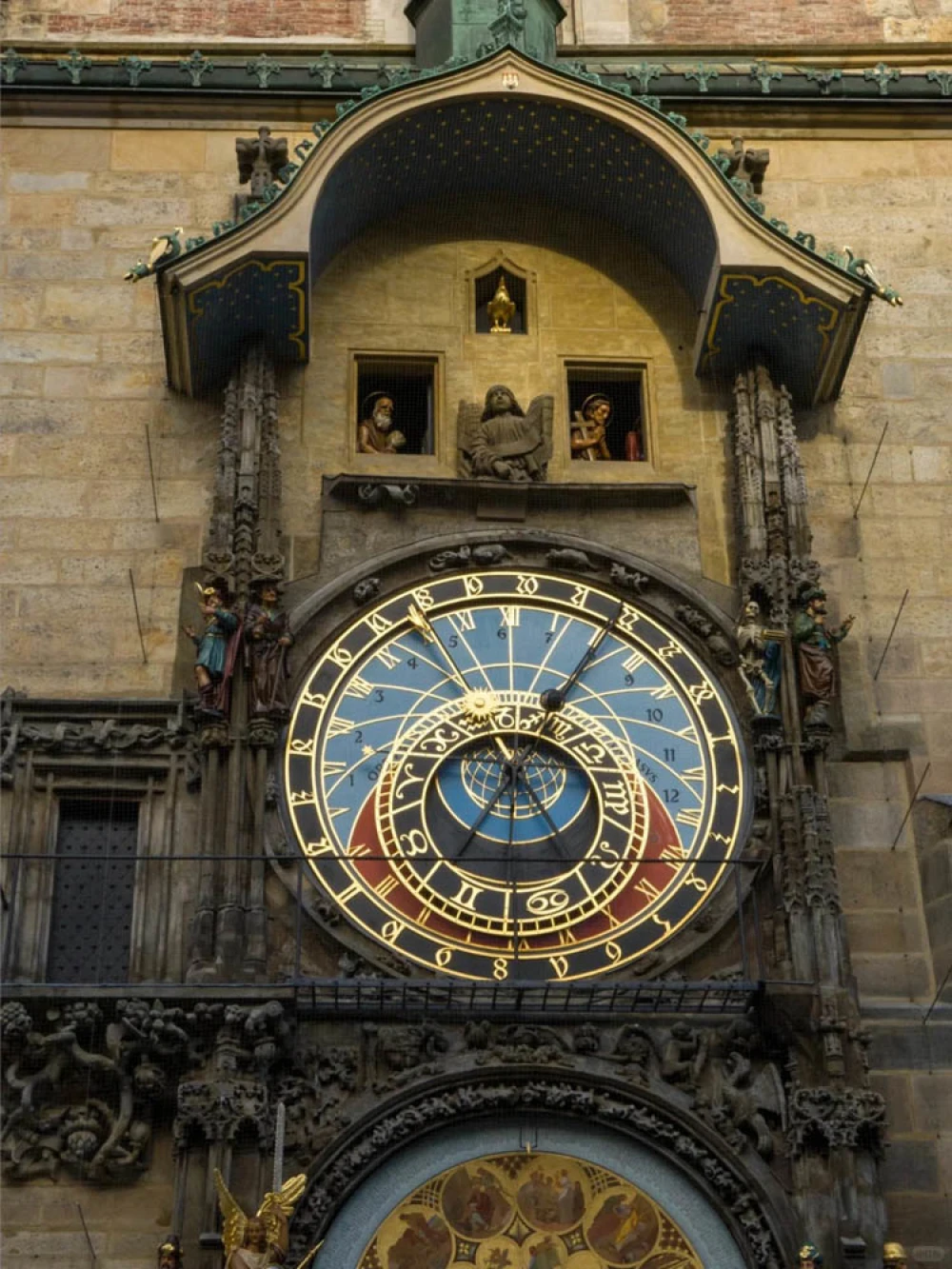 布拉格天文钟是旧市政厅南面墙的中世纪天文钟,分天文钟面、行走的 12 使徒、日历盘三部分,是闻名全球的著名景点。