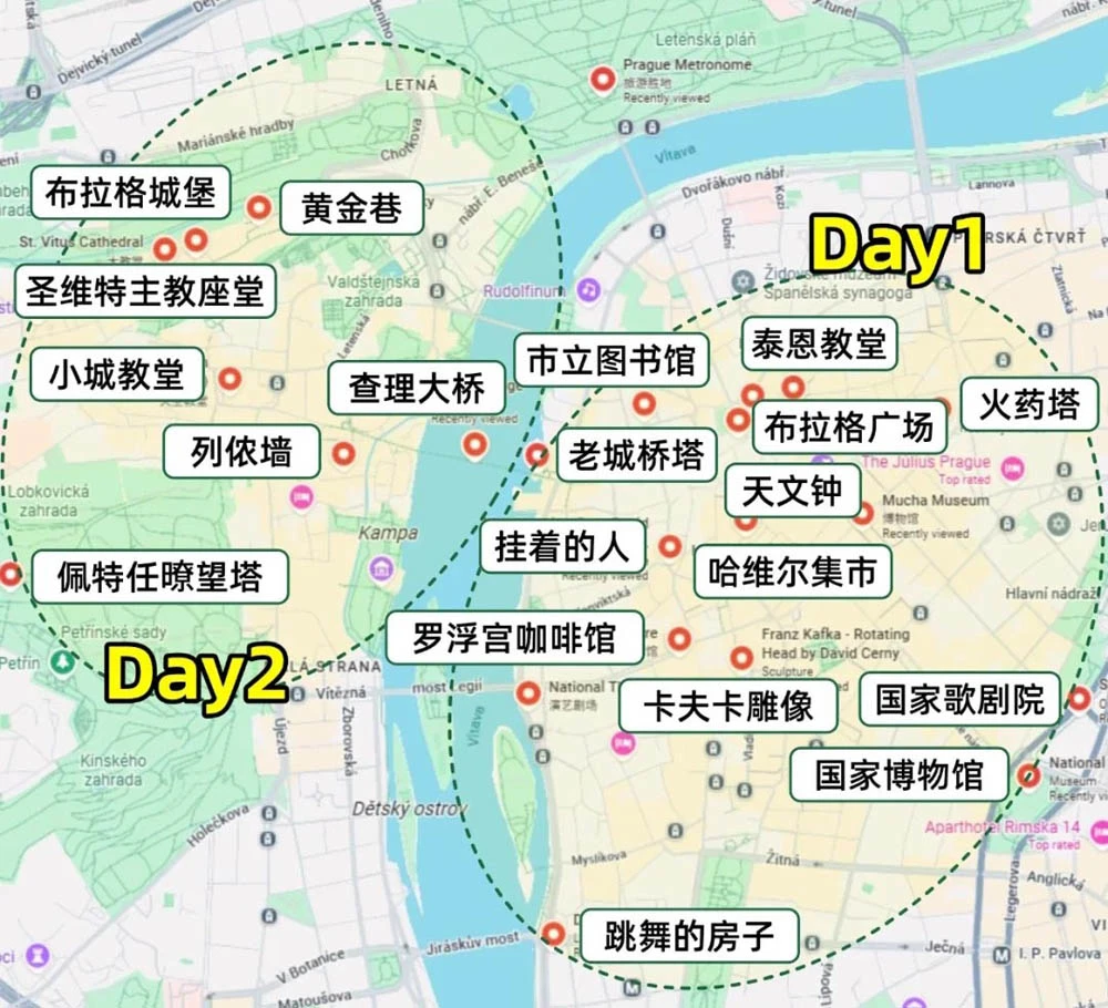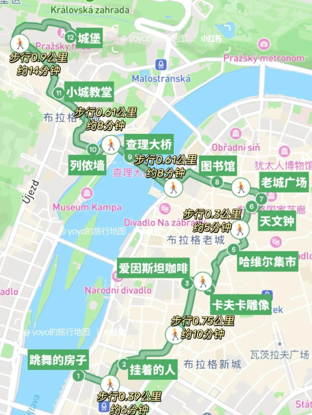 如果时间仓促只能走马观花,可以跟着这条布拉格步行路线图快速游览主要打卡点。如果在布拉格时间够长,也同样建议抽出一天的时间走一遍这条路线做city walk。
