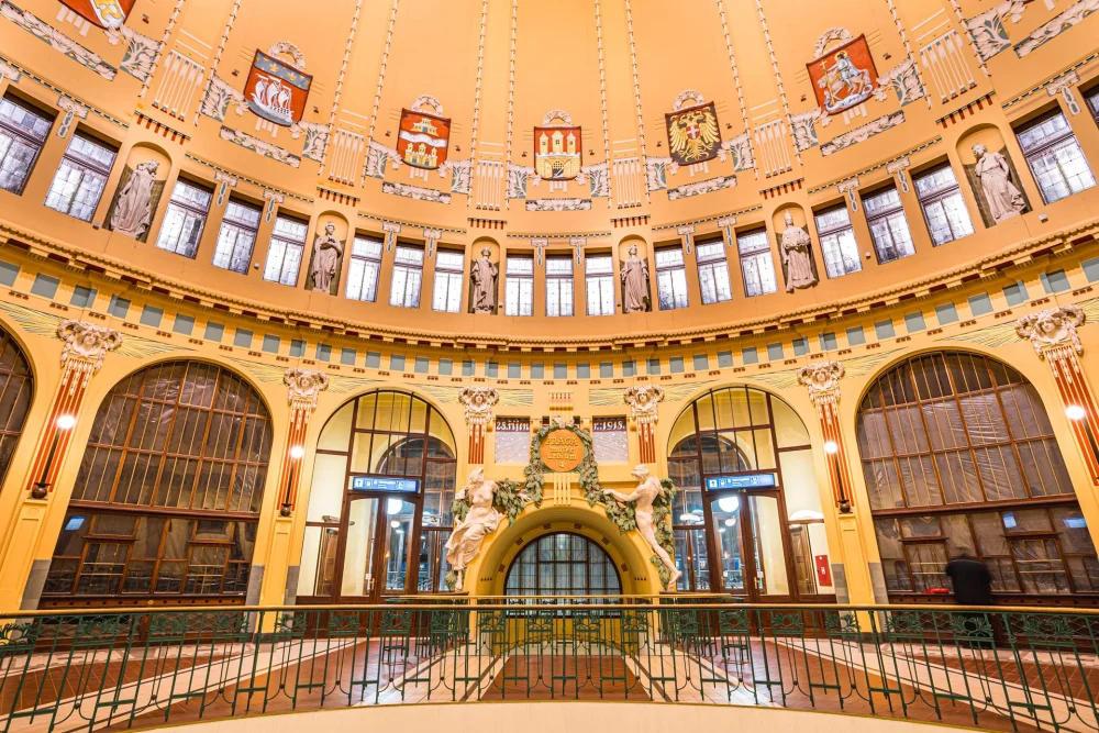 布拉格中央车站有一个新艺术风格(Art Nouveau)的车站大厅,高高的穹顶,彩色玻璃窗户,充满艺术气息。楼上Fantova Kavarna 咖啡馆旁边,原来的入口处有很多妇女的雕塑,据说是表达了布拉格为“众城之母”(Prague as the Mother of Cities)的主题。如今,它仍四溢着帝国的自信。