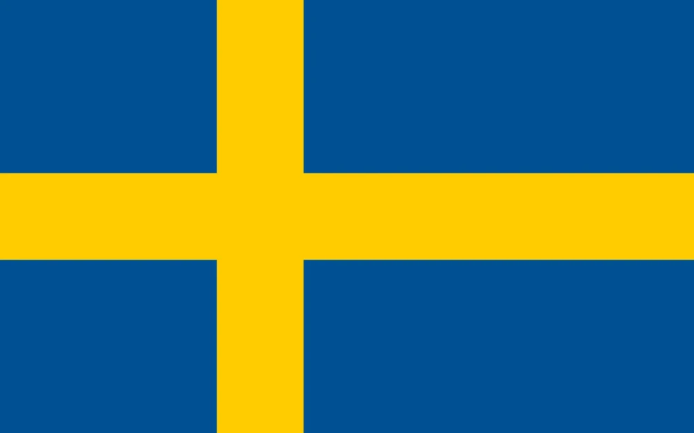 瑞典王国国旗呈长方形,长与宽之比为8:5。旗面由蓝、黄两色的构成。旗帜底色为蓝色,黄色宽条十字把旗地分成4块蓝色长方形。靠旗杆一边的上下长方形面积相等,靠右边的上下长方形面积也相等。