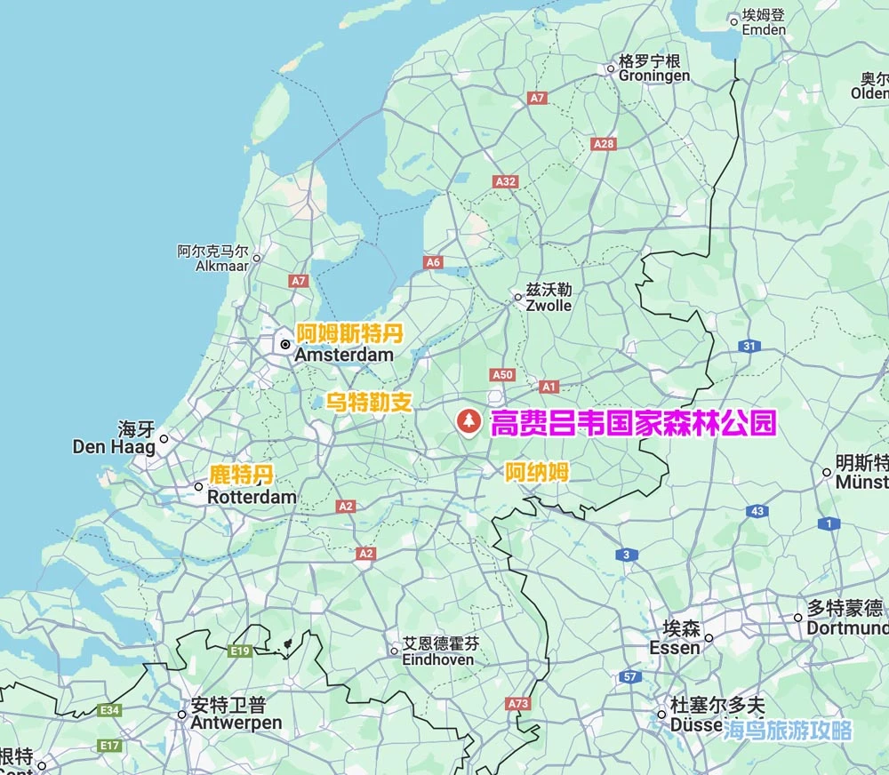 从荷兰中西部出发:坐火车到阿纳姆中央车站 (Arnhem Central),随后换乘公交前往公园南门。